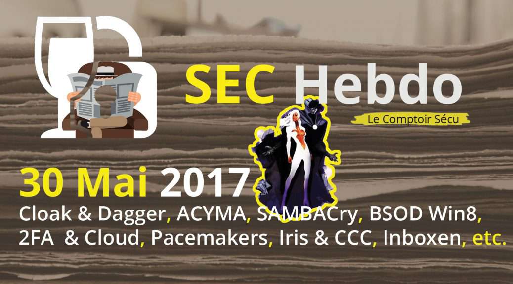 Cloak & Dagger, ACYMA, SAMBACry, BSoD Win8, 2FA & Cloud, Pacemakers, Iris & CCC, Inboxen, etc.