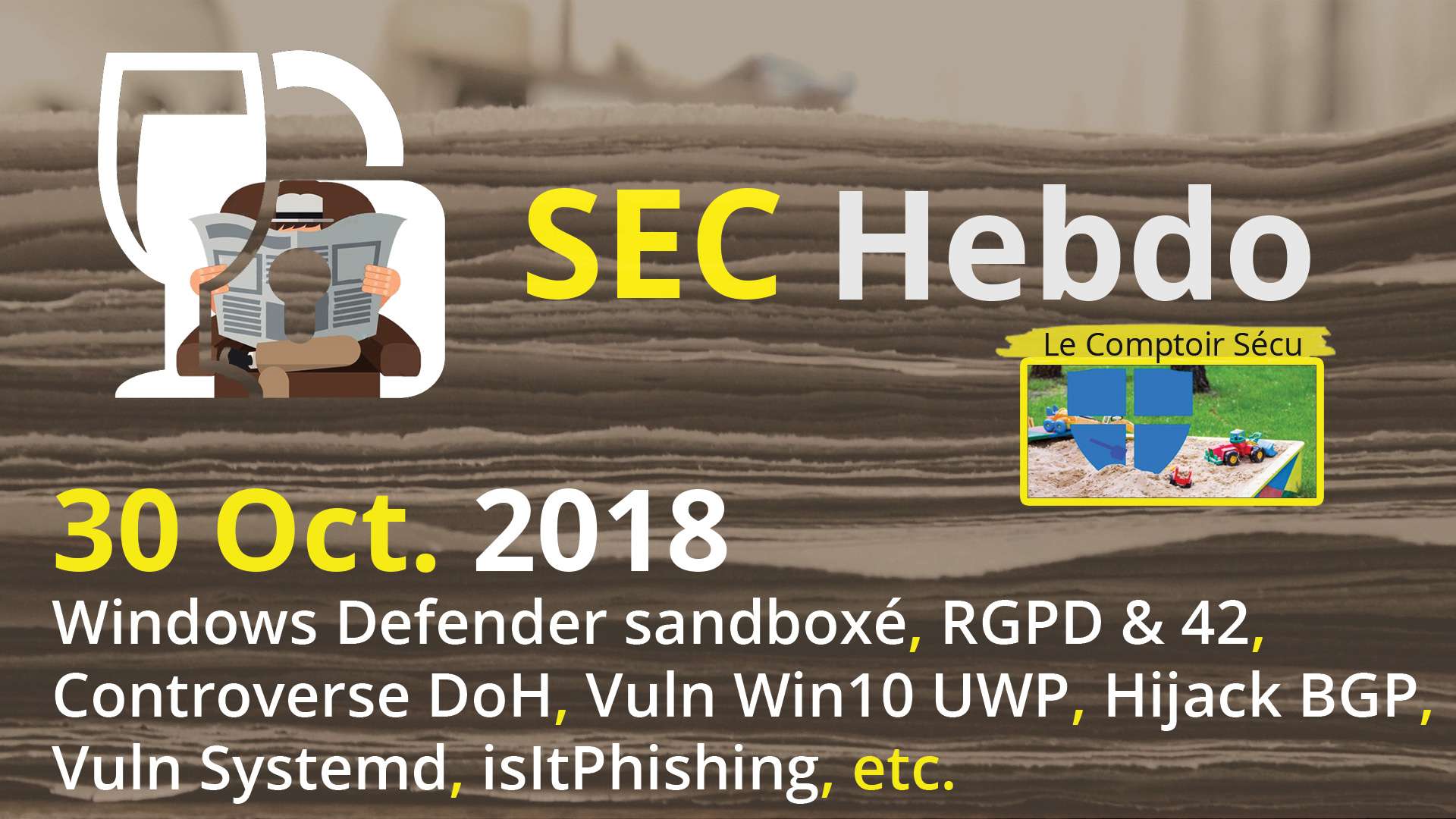 Windows Defender sandboxé, RGPD & l'Ecole 42, Controverse DoH, Vuln Win10 UWP, Hijack BGP, Vuln Sytemd, isitphishing, etc.
