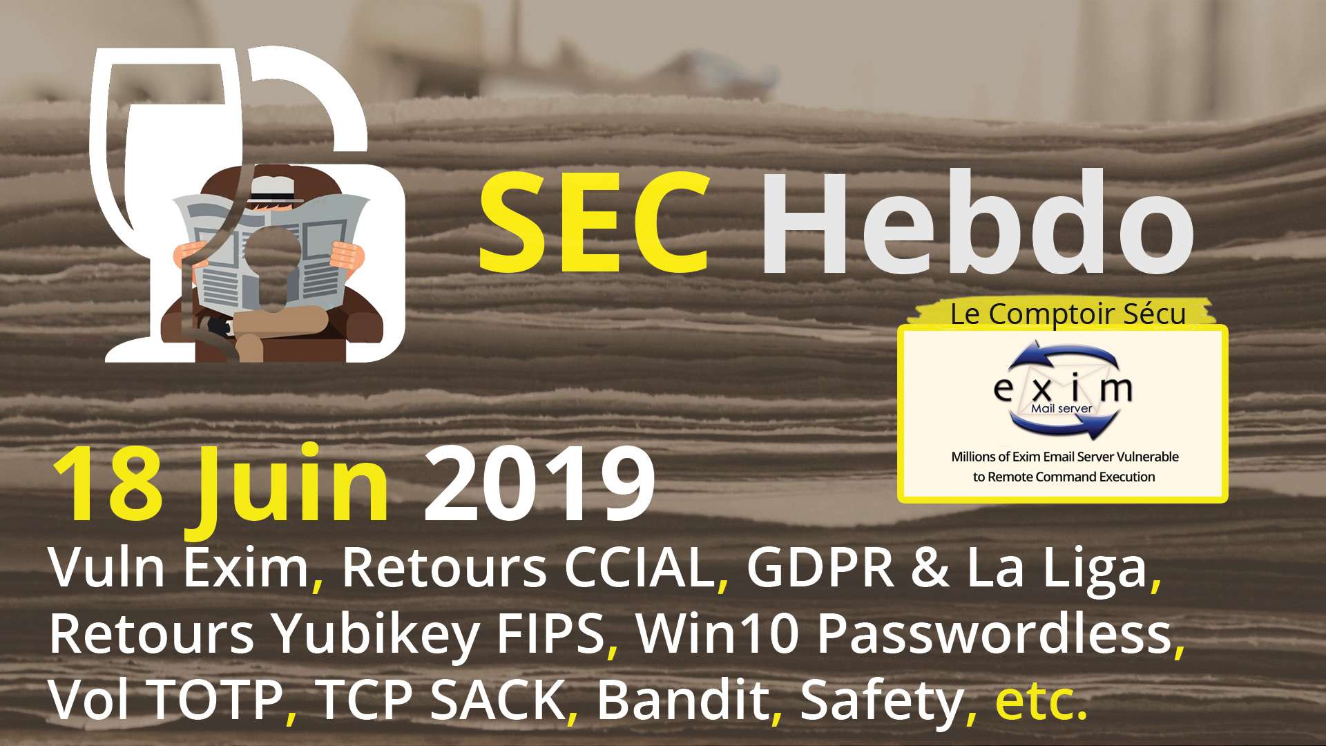 Vuln Exim, Retours CCIAL, GDPR & La Liga, Rappels Yubikey FIPS, Win 10 Passwordless, Vol TOTP, TCP SACK, Bandit, Safety, etc.